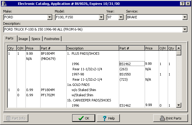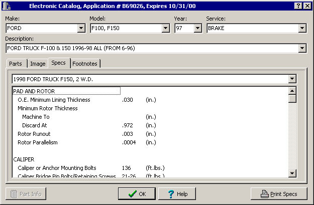 If your vendor includes brake specifications in their catalog, the specs can be displayed as well as printed for use by technicians.