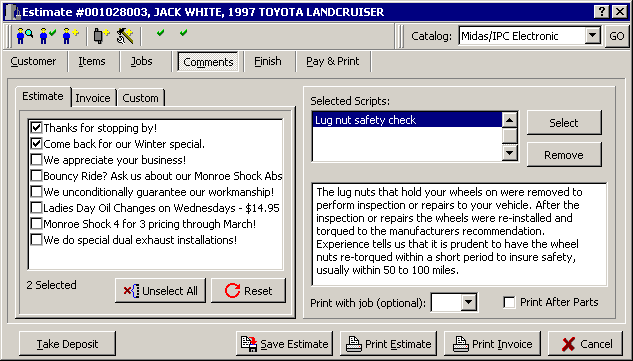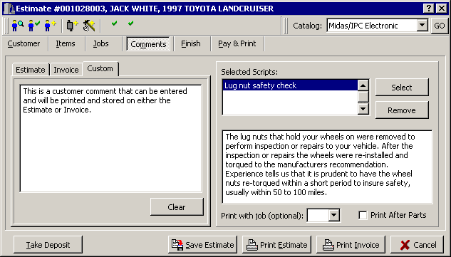 Any of your pre-defined comments can be selected as default comments to appear on either the Estimate or Invoice. In addition, you can enter a Custom comment on either of the documents. These comments are printed and are stored along with the document so that they will be there whenever its retrieved.