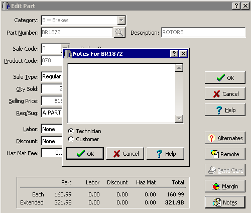 Comments on a part can be specific to the Technician and printed on the work order, or can be flagged as a customer comment and printed on the Estimate and/or Invoice. These comments can be assigned to individual parts and are stored with them in your inventory file.