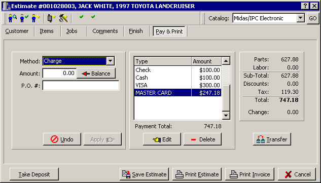 This is an example of an Invoice being paid four different ways; a check, some cash and then the balance split between two different credit cards. If the customer has an account it can be charged directly to their Accounts Receivable account.