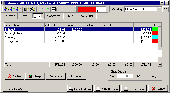 Know with a quick glance your profitability on the ticket by scanning the margin indicator at the top of the screen, as well as the color-coded PM at the end of each job. A quick glance at this example tells us that the profit on the exhaust is within the parameters we have set. But the margins realized on the brake, shocks and tires are below acceptable levels. You can also click your way to profitability when adding parts to a ticket. When the part information is displayed, the margin is also displayed.