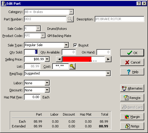 Just use your mouse to click on the right side of the margin meter until it changes color to green (or whatever color you've defined for adequate margins). The Selling Price is automatically increased, and rounded to the nearest .99 with each click. You'll no longer be caught giving some parts away at the expense of high-margins on low-priced parts! Revised May