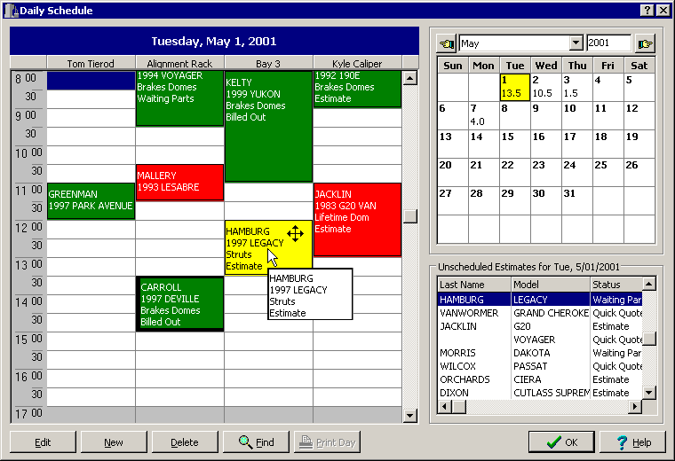 The StockTrac Enterprise Scheduler is more than a simple appointment book; it provides a visual color-coded overview of who, where and the type of service going on in the shop. By assigning Color Codes to each service type, and by having the flexibility of naming the slots either by bay, technician or both, gives you the ability to manage and schedule your time more efficiently. Scheduling appointments is a lot easier when you have this information visually displayed. To schedule an Estimate simply highlight the Unscheduled Estimate that you want scheduled (lower right-hand corner of the screen) then, using your mouse, hold down the left-button and drag the Estimate to the desired time slot on the Daily Schedule, then release the button. Once the work is scheduled, you can click on a job and drag the borders up or down to decrease or increase the length of the appointment. You can also drag it to another Bay/Technician or even move the appointment to another day and time! Revised May