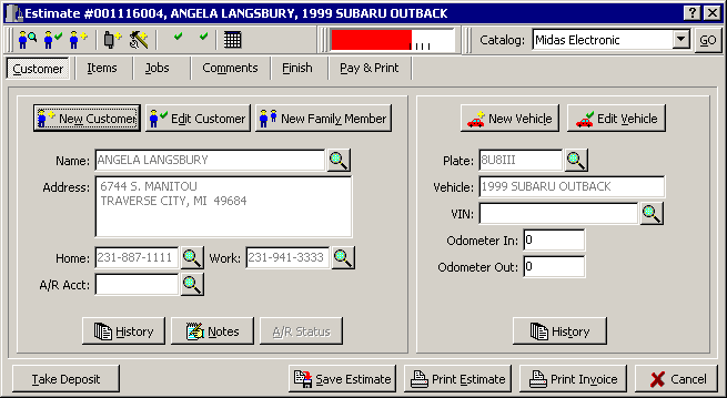 Simple left-to-right flow from the time the customer enters the door until he walks out. East to learn, even for computerphobias! Just complete the Customer information, add the Items, review the Jobs, enter any user-defined Comments, Finish by completing salesperson and technician information and Pay & Print using any combination of cash, checks and/or multiple credit cards. Revised May